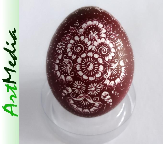 Wyrób wykonany na skorupie, wydmuszce jaja kurzego, metodą rytowniczą.