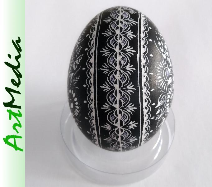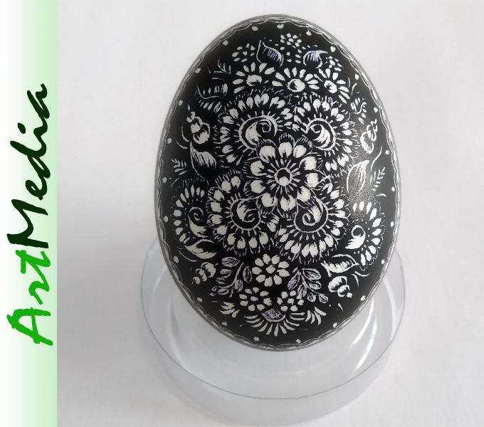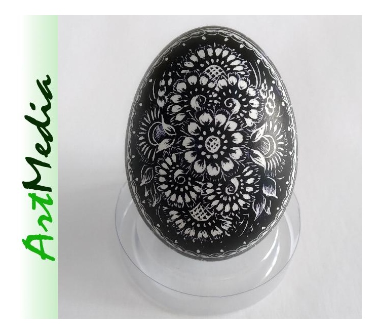 Wyrób wykonany na skorupie, wydmuszce jaja kurzego, metodą rytowniczą.