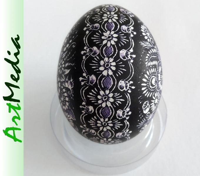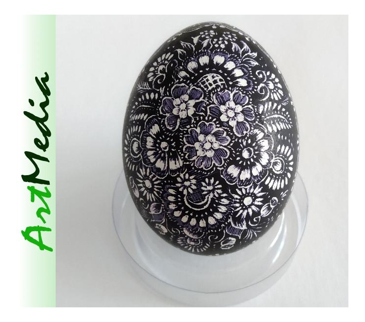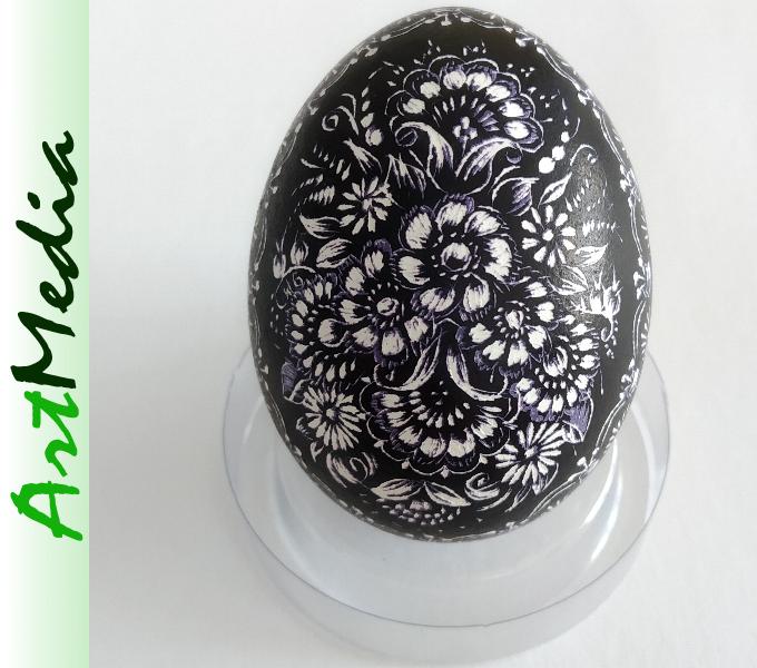 Wyrób wykonany na skorupie, wydmuszce jaja kurzego, metodą rytowniczą.