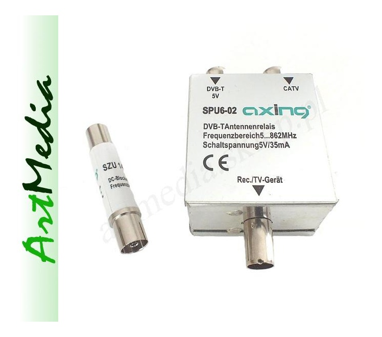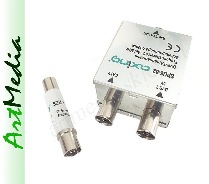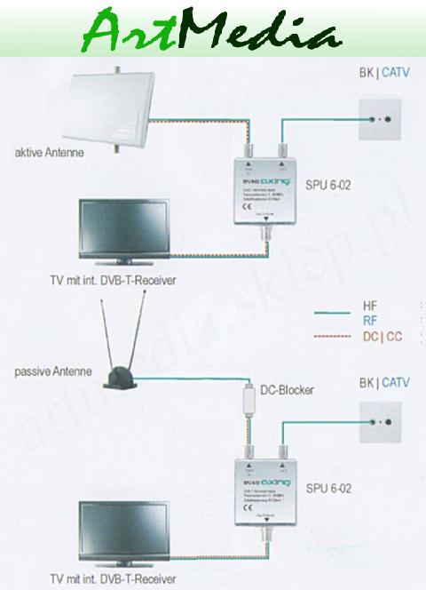 Przełącznik SPU 6-02 pozwala na równoczesny dostęp do sygnałów DVB-T oraz DVB-C ( telewizja kablowa ) bez konieczności ręcznej zmiany kabli jednego źródła na drugie. Przełącznik jest sterowany napięciem 5V wysyłanym przez odbiornik. Jeżeli napięcie nie pojawi się na wyjściu urządzenia, to przełącznik dostarcza sygnał CATV. Jeżeli odbiornik TV naziemnej ( lub telewizor ) poda napięcie 5V, to przełącznik wybiera wejście DVB-T. Napięcie jest wtedy przekazywane na wyjście DVB-T i może być wykorzystane do zasilenia wzmacniacza anteny DVB-T. Jeżeli używamy anteny pasywnej ( bez wzmacniacza ), to na wyjściu toru DVB-T należy zamontować DC blocker znajdujący się w komplecie.