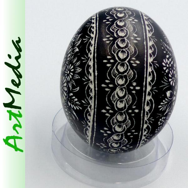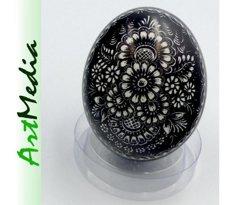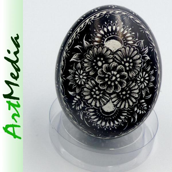 Wyrób wykonany na skorupie, wydmuszce jaja kurzego, metodą rytowniczą.